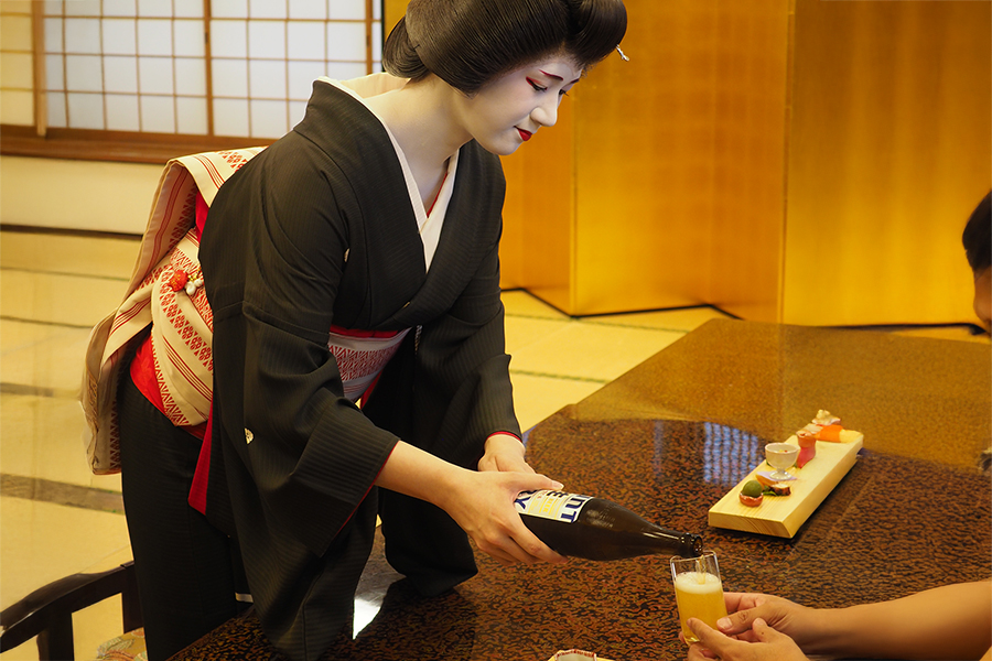 稚加榮が誇る季節の会席料理とお酒を味わいながら、美しい芸妓衆と心ゆくまで語らいのひとときを。芸妓さんの洗練されたおもてなしと細やかな心遣いで、大切なお客様にもお喜びいただけます。